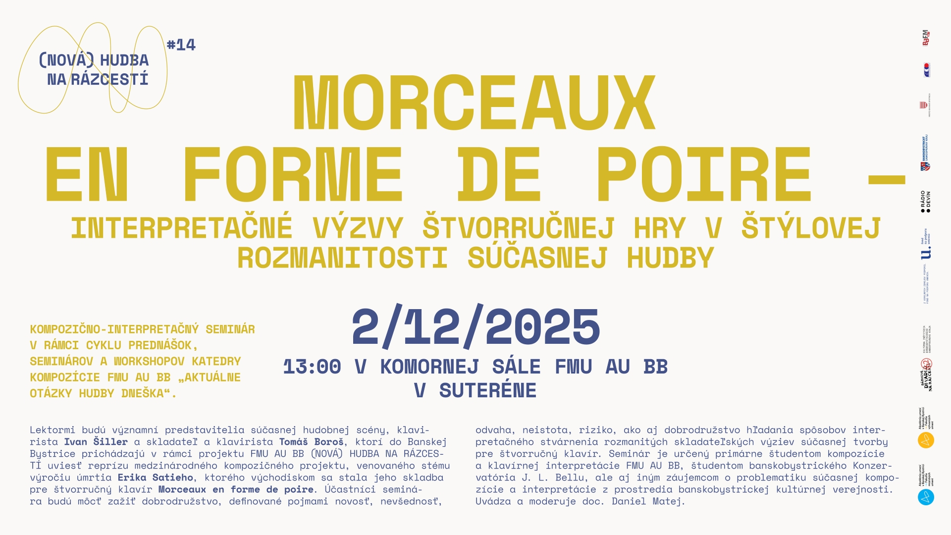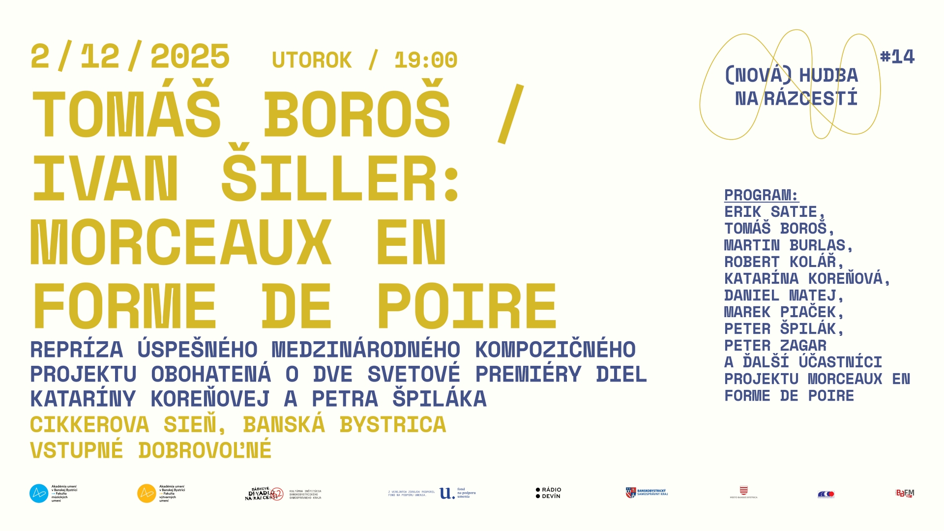 PROGRAM: Erik Satie, Tomáš Boroš, Martin Burlas, Robert Kolář, Katarína Koreňová, Daniel Matej, Marek Piaček, Peter Špilák, Peter Zagar a ďalší účastníci projektu MORCEAUX EN FORME DE POIRE